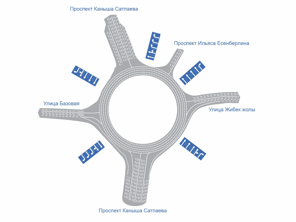 - на проспект Каныша Сатпаева с четырех полос (крайняя левая полоса разрешает движение только прямо).