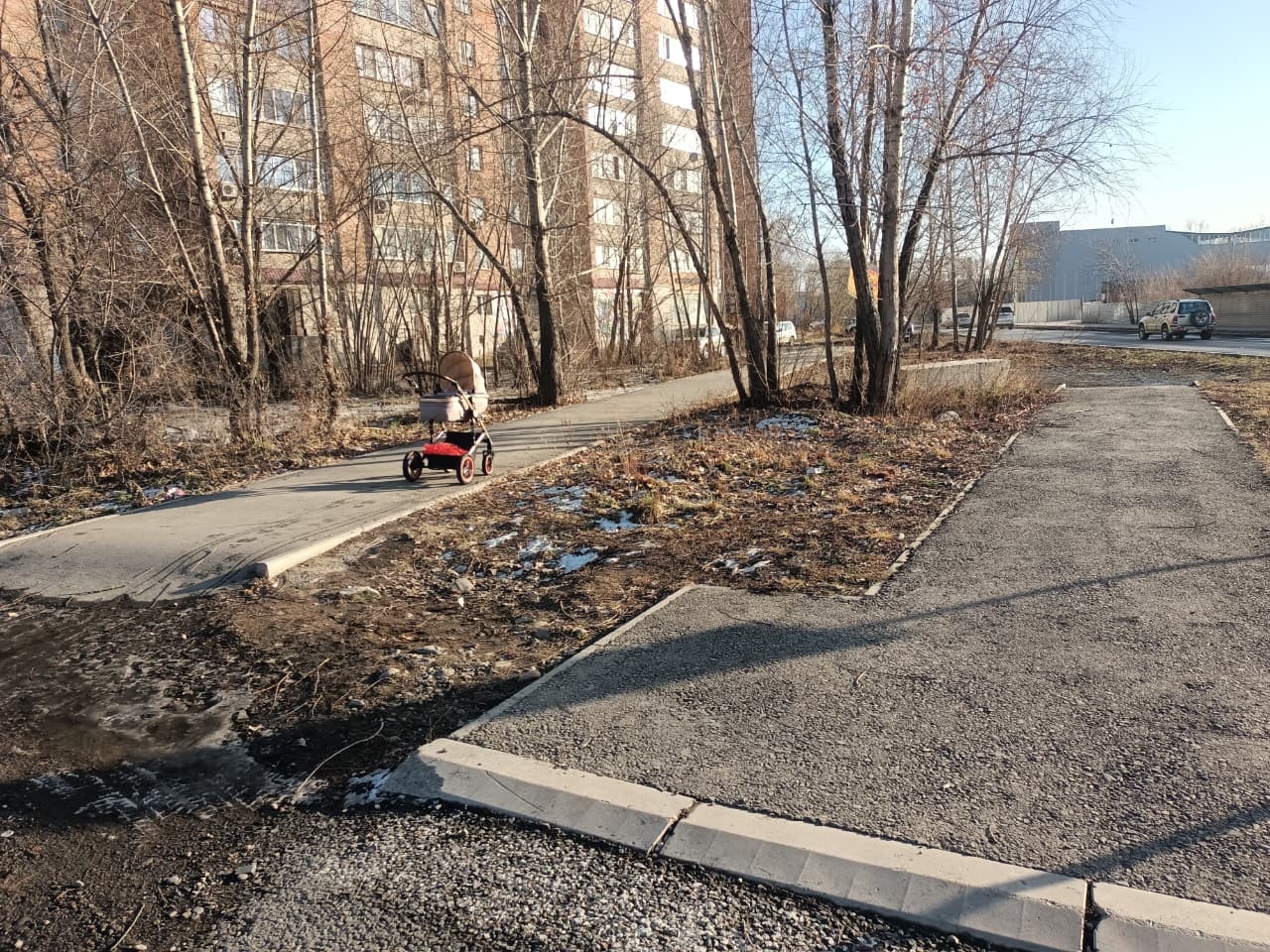 Пешеходная зона вдоль дома на улице Красина, 11 ведет к новой набережной, где в хорошую погоду довольно многолюдно. Но чтобы дойти до набережной, нужно пройти квест: перепрыгнуть через грязь, обойти мусор, «сползти» с бордюра, если идешь с коляской — поднять её на возвышение, а потом снова опустить.