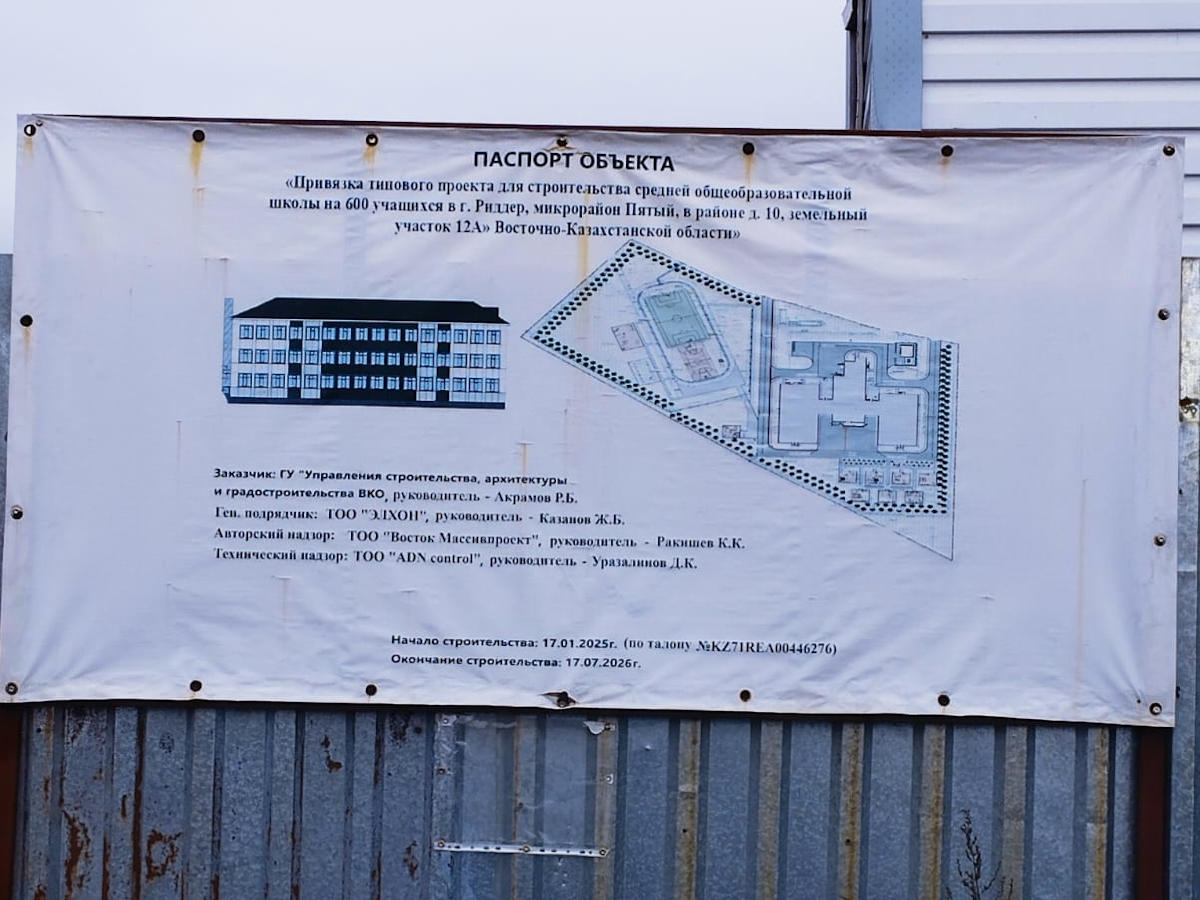 Согласно информации паспорта объекта, окончание строительства средней общеобразовательной школы на 600 учащихся в Пятом районе Риддера намечено на 17 июля 2026 года.