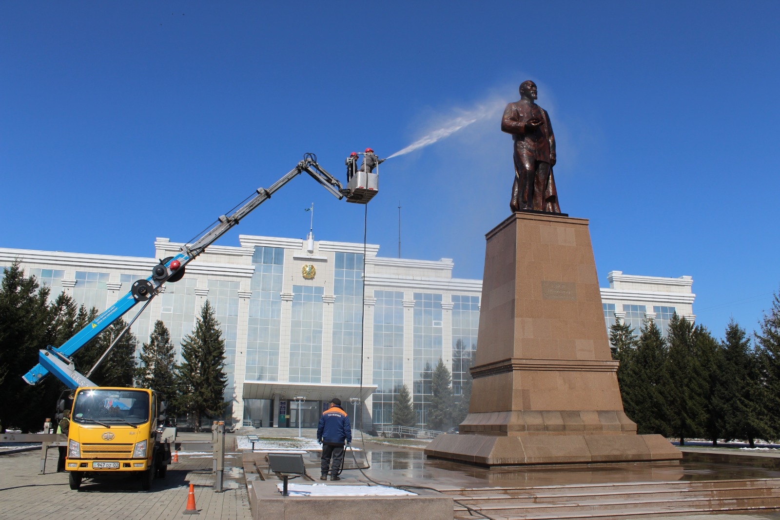 Памятник великому казахскому мыслителю на площади Республики отмыли от пыли и загрязнений. Конструкции со «Словами назидания» очистили молодые госслужащие, а сам монумент при помощи поливальной машины и вышки привели в порядок сотрудники «Таза Өскемен».