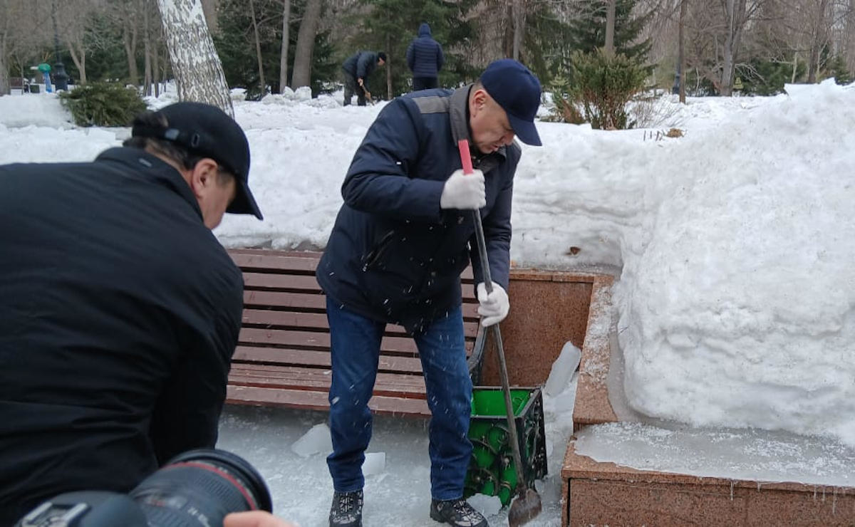 Акция стартовала в 10.00. Фронт работ включал уборку мусора и расчистку дорожек парка ото льда и снега. Кроме того, для памятника великому акыну, украшающего центральную площадку зоны отдыха, настало время водных процедур – статую предстояло вымыть и обновить гранитную плитку на пьедестале.